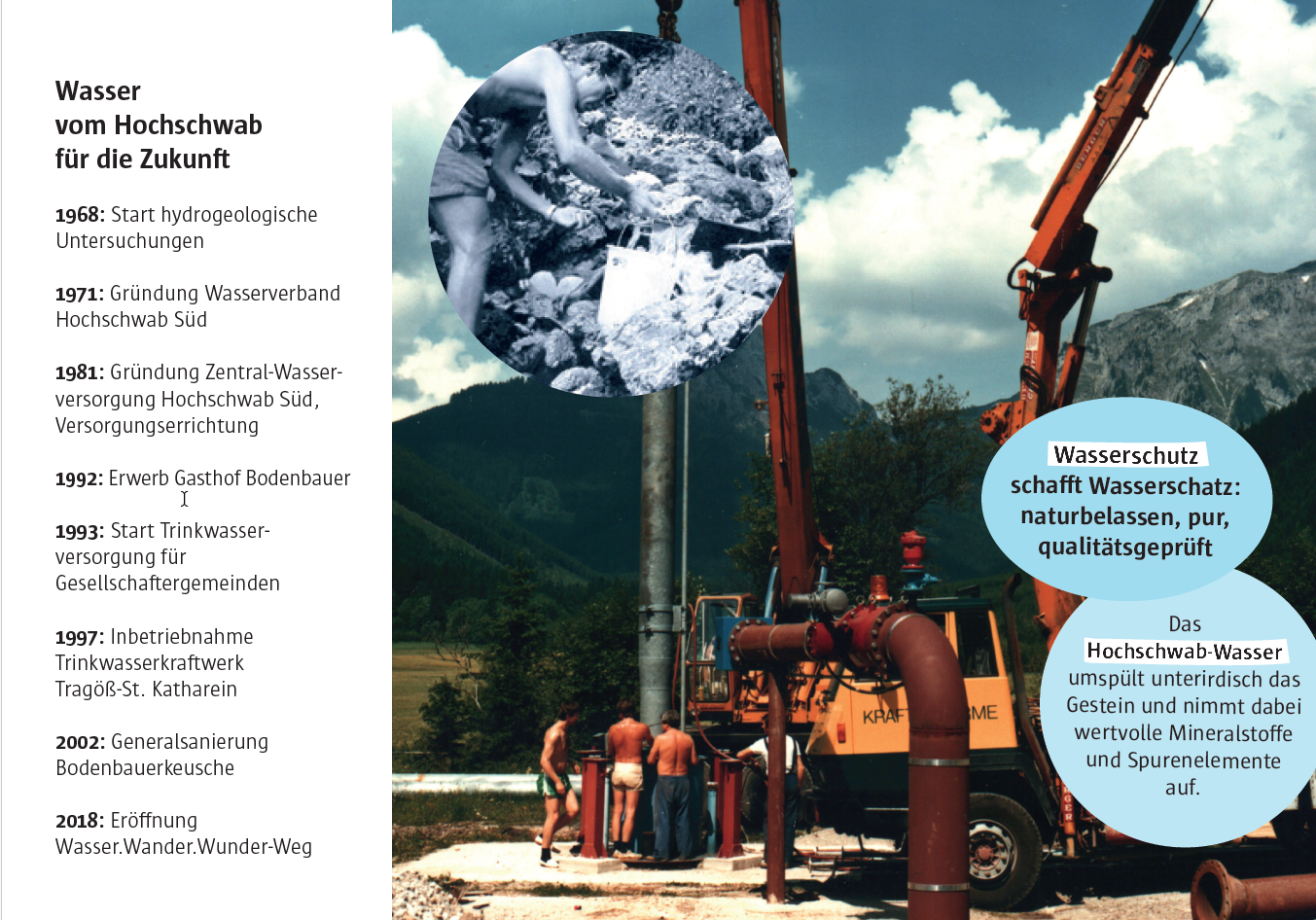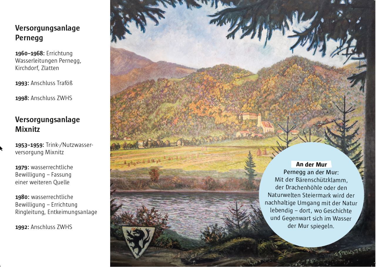Heute ist es selbstverständlich, dass reinstes Trinkwasser aus unseren Wasserhähnen kommt. Das war nicht immer so. Schauen wir gemeinsam darauf, dass es so bleibt! Wenn du in die Bilder unten hineinklickst, erfährst du etwas über die wasserreiche Geschichte der ZWHS-Partner:innen. Die ZWHS ist die Zentral-Wasserversorgung Hochschwab Süd, die das Wasser vom Hochschwab bis nach Graz bringt, und sie ist für den Weg verantwortlich.